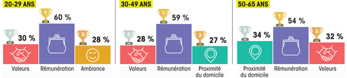 - L’adéquation aux VALEURS PERSONNELLES, la PROXIMITÉ DU DOMICILE et l’AMBIANCE DE TRAVAIL viennent ensuite, avec des différences selon l’âge. La proximité du domicile est plus valorisée par les personnes de 50 ans et plus, et les valeurs chez les moins de 50 ans.